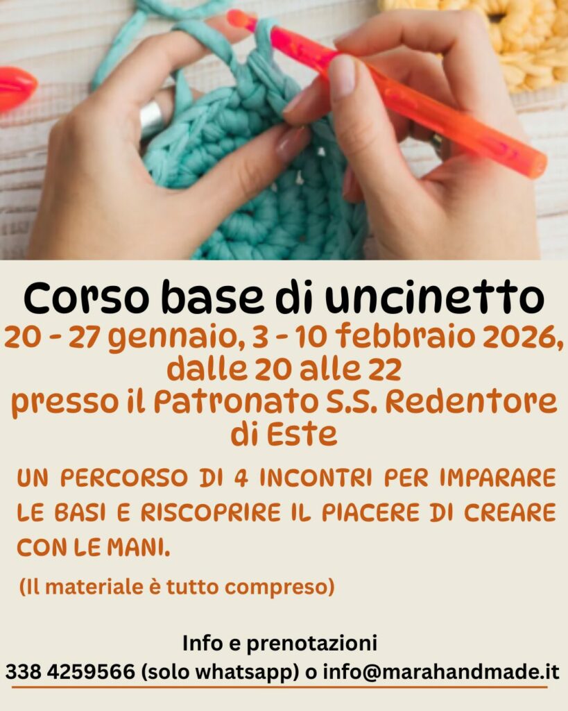 CORSO BASE DI UNCINETTO Gennaio 12, 2026 4:00 pm PrecedentePrecedentePENSARE OGGI AL DOMANI SuccessivoSEGNI DI SE’, SEGNI DI CARTASuccessivo Senza categoria SEGNI DI SE’, SEGNI DI CARTA Senza categoria CORSO BASE DI UNCINETTO Senza categoria PENSARE OGGI AL DOMANI